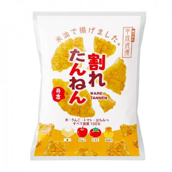 一枚丹念の割れせんです。うるち米と相性の良い米油でカラッと揚げています。醤油ベースで、隠し味の国産はちみつ、りんご果汁、トマト果汁がやさしい甘さ。弊社の大人気商品です。